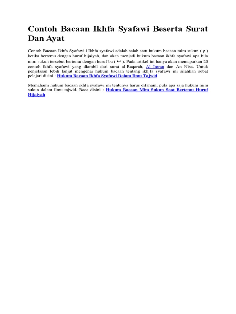 30 contoh ikhfa dalam al quran beserta surat dan ayatnya sabtu 11 agustus 2018 al quran contoh tajwid ikhfa ikfa merupakan salah satu hukum nun mati dan tanwin bertemu huruf hijaiyyah. Tujuannya untuk memberikan banyak contoh agar para pembaca bisa memahami bacaan ini dengan baik dan benar. Cara membaca yaitu dengan membuat bunyi bacaan menjadi samar antara idzhar dan idgham. Contoh bacaan ikhfa syafawi dalam juz amma beserta surat dan ayatnya. Contoh bacaan ikhfa syafawi dalam juz amma sekedar mengingatkan kembali bahwa yang dimaksud dengan hukum bacaan ikhfa syafawi dalam ilmu tajwid ialah hukum bacaan apabila mim م mati bertemu dengan huruf ba ب maka itulah yang dimaksud ikfa syafawi dan cara membacanya adalah disamarkan dan mim matinya dibaca ghunnah. 22 nun sukun bertemu dengan ta فلا تجعلوا لله أندادا وأنتم تعلمون 2.