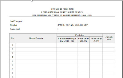 Format penilaian lomba format penilaian lomba hafalan surat surat pendek tingkat tpa se kecamatan ambarawa romadhan 1432 h. Administrasi lomba hafalan surat pendek sdmi tahun 2018 download contoh format lomba hafalan surat pendek sdmi terbaru contoh formulir pendaftaran ketentuan lomba penilaian lomba hafalan surat pendek sdmi tahun 2018 format doc.