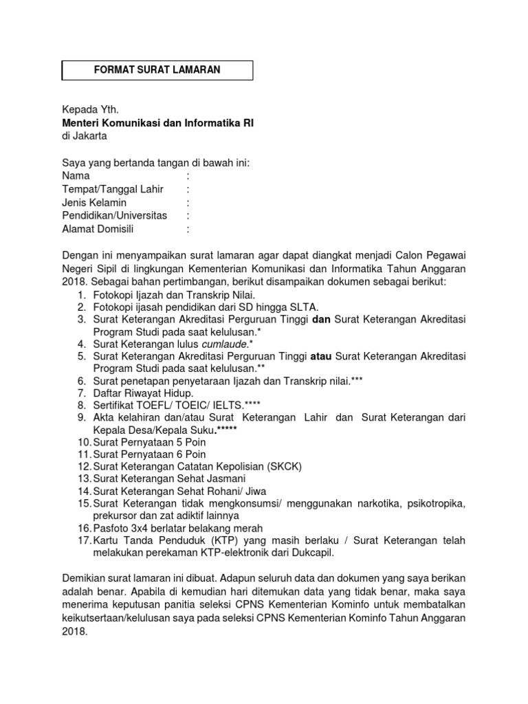 Format contoh surat lamaran cpns 2019 di kemenkumham kemenag dan kemenlu bisa dilihat di bagian bawah artikel ini. Langkah langkah membuat surat lamaran kerja template indonesia adalah.