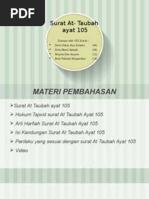 Dalam ayat ini terdapat ancaman bagi mereka yang tetap di atas kebatilan kesesatan dan maksiatnya. Surat at taubah التوبة merupakan surat madaniyah. Makna ayat ini bisa juga bahwa amal yang kamu lakukan baik atau buruk maka allah mengetahunya. Dalam pelajaran buku pai smp paling sering ditanyakan adalah isi kandungan dan juga tentang perilaku contoh sikap yang mencerminkan surat dan ayatnya begitu pula dalam surat at taubah ayat 5 ini. Katakanlah wahai rasul kepada orang orang yang tidak pergi ke medan jihad dan bertobat dari dosanya tutupilah kerugian yang timbul dari kesalahan kalian di masa lalu ikhlaskanlah amal kalian kepada allah dan lakukanlah hal hal yang diridai nya. Dan katakanlah kepada mereka yang bertobat bekerjalah kamu de ngan berbagai pekerjaan yang mendatangkan manfaat maka allah akan melihat pekerjaanmu yakni memberi penghargaan atas pekerjaanmu be 9105.