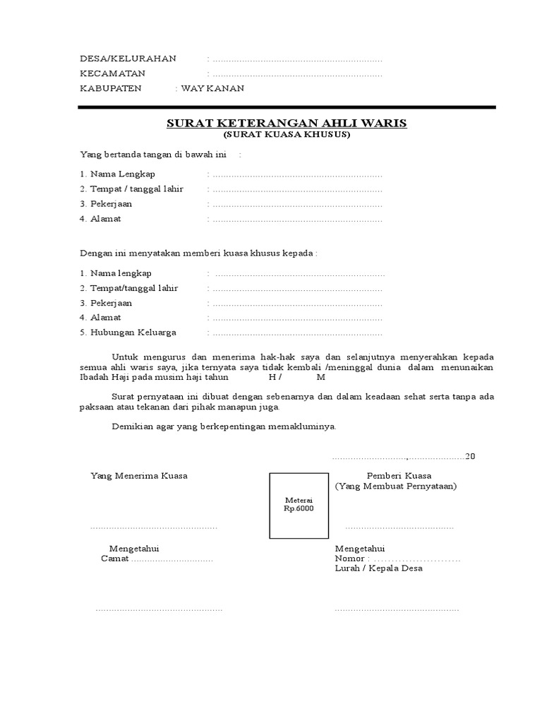Contoh surat ahli waris dari kecamatan. Contoh surat keterangan ahli waris ini tentunya akan menjelaskan tentang siapa saja ahli waris dari seseorang pewaris sehingga harta. Jadi surat adalah alat komunikasi tertulis yang disampaikan dari satu pihak kepada pihak lain. Contohsuratid surat yang artinya kertas yang bertulis atau secarik kertas sebagai tanda atau keterangan sesuatu yang ditulis. Contoh surat pernyataan ahli waris. Kami yang bertanda tangan di bawah ini adalah ahli waris dari bapak. Demikian surat pernyataan ahli waris ini kami buat dengan sebenarnya dan dalam keadaan sehat baik jasmani maupun rohani serta tanpa ada paksaan berupa apapun dari pihak manapun juga.