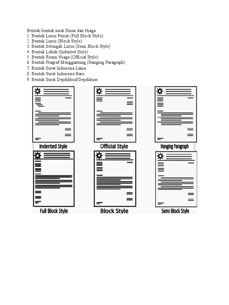 Bentuk lurus block style surat yang ditulis dalam bentuk lurus pada dasarnya mirip dengan bentuk surat lurus penuh. Kemudian unutk baris keduannya menjorok masuk lima hentakan. Bentuk surat lekuk dan bentuk surat setengah lurus tidak jauh berbeda. Bentuk ini biasanya menggunakan paragraf melekuk dan terlihat tidak rapih namun bukan berarti tidak terstruktur contohnya bisa kita lihat bahwa alenia paragrafnya sangat terstrukture dan mirip dengan tangga turun kebawah. Adapun perbedaannya terletak pada penulisan alamat tujuan. Bentuk surat indented style bentuk surat indented style ciri ciri bentuk surat lekuk atau indented style dan contoh surat.