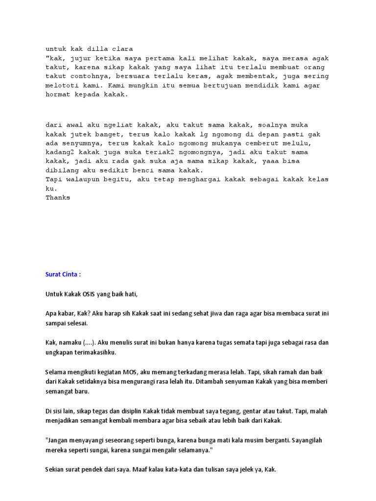 Contoh surat cinta untuk kakak kelas mos. Jika memiliki perasaan cinta kepada lawan jenis maka media pertama yang akan digunakan untuk menyatakan cinta biasanya adalah surat cinta. 16 contoh surat cinta singkat islami untuk senior kakak kelas mos. Mudah mudahan contoh surat ini dapat menginspirasi anda dalam membuat surat cinta buat kakak kelasbaca juga contoh surat cinta tentang rindu. Dear kak kikok yang cantik kak kikok namaku zamzam aku anak baru kelas 1b. Anda pun bisa merangkai kata kata seromantis mungkin agar menarik perhatian senior anda. Surat cinta untuk senior bisa diberikan kepada senior sekolah senior kampus kakak senior laki laki kakak senior perempuan kakak senior ospek senior osis dan lain sebagainya.