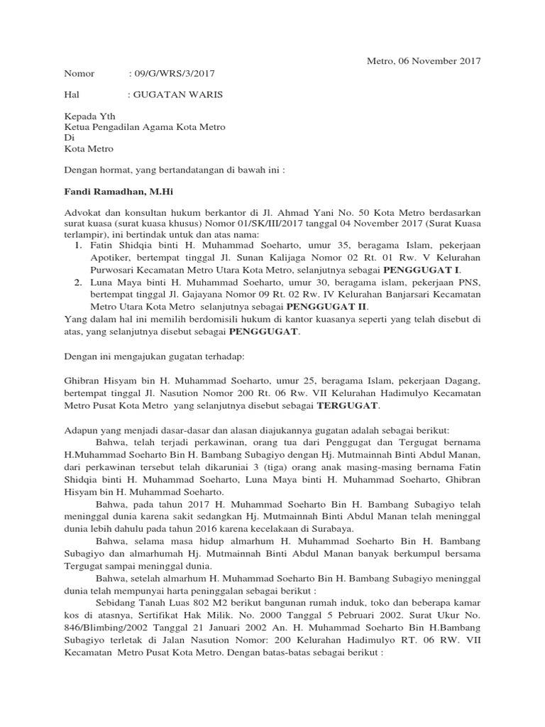 Kepada ketua pengadilan negeri. 200 kelurahan blimbing rt. Ayah penggugat pada tahun 2014 sebagai warisan keluarga dan sertifikatnya telah langsung dibalik nama atas nama suami penggugat. 846kisamaun2004 tanggal 21 desember 2003 an. 2000 tanggal 5 januari 2004. Contoh surat gugatan waris tangerang 20 juni 2015.