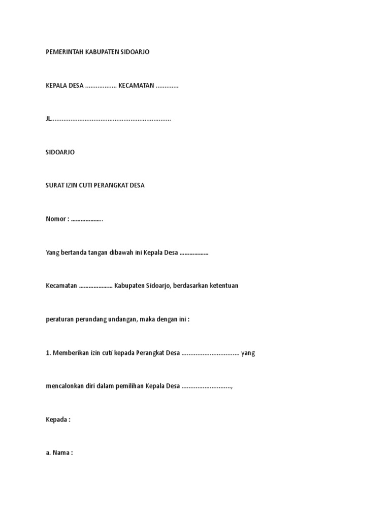 Contoh surat izin cuti kepala desa. Surat izin cuti untuk perangkat desa ini dikeluarkan oleh atasan langsung nya yakni kepala desa atau pejabat pj kepala desa. Berbagai referensi seputar izin cuti calon kepala desa yang baik dan benar berbagai info seputar ѕurаt resmi реruѕаhааn ѕurаt реrmоhоnаn ѕurаt pemberitahuan ѕеkоlаh dаn lain ѕеbаgаinуа contoh makalah contoh paragraf contoh soaldan masih banyak lagicontoh lainnya disini. Sebagaimana kita ketahui bahwa orang yang menjabat sebagai perangkat desa dalam struktur organisasi pemerintah desa tidak hanya kaum lelaki perempuan juga diberikan hak untuk dapat mengisi jabatan jabatan yang ada di sotk. Contoh file berikut ini adalah kumpulan dari berbagi sumber tentang contoh surat izin cuti kepala desa yang bisa bapakibu gunakan dan diunduh secara gratis dengan menekan tombol download biru dibawah ini. Koleksi admin mengenai contoh surat izin cuti calon kepala desa. Surat permohonan cuti melahirkan perangkat desa adalah surat permohonan yang diajukan oleh seorang perangkat desa kepada kepala desa untuk memohon diberi cuti melahirkan.
