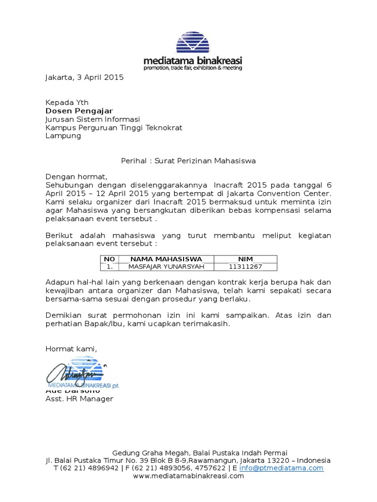 15 contoh surat pengajuan permohonan izin bantuan dan kerjasama seiring dengan perkembangan zaman dan kemajuan teknologi yang semakin canggih penggunaan surat sebagai media komunikasi pun memang semakin menipis. Di kampus banyak sekali kegiatan mahasiswa yang terkadang membutuhkan surat izin baik izin dari pihak kampus rektorat izin orang tua ataupun mungkin juga surat izin dari kepala desa setempat bahkan rt rwsurat izin ini tentunya untuk mendukung lancarnya sebuah kegiatan yang akan dilaksanakan kepanitiaan kelompok mahasiswa organisasi kemahasiswaan. Asal tak bolos atau tidak masuk lebih dari empat kali di tiap mata kuliah maka mereka merasa aman.