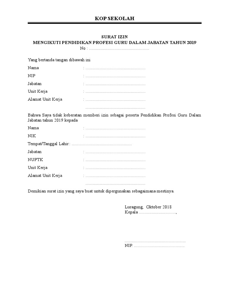 Berikut ini contoh surat izin mengikuti ppg ppg. Surat izin kepala sekolah mengikuti ppg format word seperti kita ketahui sebelumnya peserta yang ikut program ppg dalam jabatan harus menjalani beberapa rangkaian kegiatan. Contoh format surat keterangan izin belajar guru ppg salam hangat dan hormat. Salah satu persyaratan berkas yang harus di kumpulkan yaitu membuat surat izin dari kepala sekolah atau kepalaketua yayasan untuk menjadi peserta ppg 20192020.