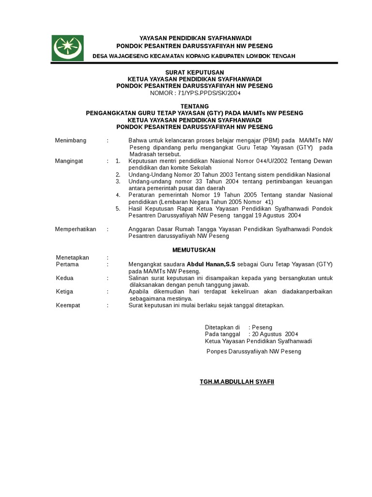 Surat keputusan diperlukan bilamana seorang pemimpin atau atasan membuat keputusan di suatu pihak atau kelompok. Surat keputusan pengurus yayasan pesantren islam ypi tanjung anom nomor. Contoh sk pensiun guru swasta doc. Contoh sk guru tetap yayasan ini dibuat dalam format word atau doc sehingga memungkinkan bapakibu guru bisa merubahnya sesuai dengan keadaan dan kebutuhan madrasah bapakibu masing masing. Sk pengangkatan pengurus kelompok tani pdf document.