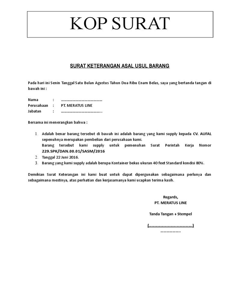 Contoh surat keterangan asal barang. Contoh surat keterangan asal usul tanah contoh surat keterangan asal usul tanah contoh surat keterangan kerja contoh surat keterangan contoh surat keterangan sehat contoh surat keterangan usaha contoh surat keterangan lulus contoh surat keterangan penghasilan contoh surat keterangan ahli waris contoh surat keterangan minat contoh surat keterangan sekolah contoh surat lamaran kerja. Berdasarkan pemaparan tersebut dapat kita simpulkan bahwa certificate of origin coo atau surat keterangan asal ska merupakan dokumen yang dibuat oleh eksportir seller dan disertakan pada saat mengirim mengekspor barang ke suatu negara tertentu dimana negara penerima barang tersebut telah menyepakati suatu perjanjian untuk memberikan suatu kemudahan bagi barang dari negara asal origin. 1seluruh instansi penerbit surat keterangan asal ipska. Laporan mingguan dan bulanan. Contoh surat pernyataan barang. 2para eksportir pengguna surat keterangan asal ska form a gsp eu di tempat dikarenakan dampak pandemi covid 19 yang menyebabkan kurang optimalnya pendaftaran eksportir teregistrasi er di seluruh indonesia maka masa transisi implementasi deklarasi asal barang dab dalam skema registered exporter generalized system of.