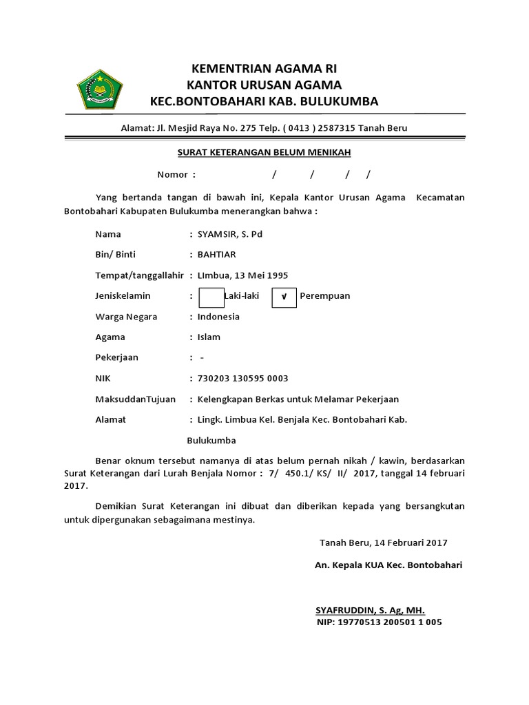 Contoh surat keterangan belum menikah dari desa. The collection that consisting of chosen picture and the best. Contoh surat keterangan nikah siri dari desa have an image from the othercontoh surat keterangan nikah siri dari desa it also will feature a picture of a sort that may be observed in the gallery of contoh surat keterangan nikah siri dari desa. Seperti pada surat resmi lainnya pada surat keterangan belum menikah juga ada kop suratnya. Kita harus memiliki skill atau kemampuan yang bisa membantu kita untuk masuk ke dalam dunia kerja. Untuk keperluan melamar pekerjaan masuk tnipolisi di samping surat pernyataan seperti contoh di atas surat keterangan belum pernah menikah nantinya akan dibuat dalam blanko khusus dari kelurahandesa blanko model pm1 yang ditanda tangani oleh lurahkepala desa dan diketahui oleh kepala kua setempat. Word document melalui link di bawah ini.