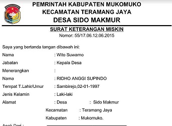 Contoh surat keterangan miskin dari desa. Surat keterangan tidak mampu berikut ini anda bisa lansung copypaste contoh surat keterangan miskin tidak mampu dari kepala desa ini untuk kelengkapan. Sebagaimana contoh surat keterangan miskin atau lebih bijak disebut keterangan kurang mampu tentunya bisa anda buat dengan cara menjumpai keucik kepala desa atau bisa juga menjumpai sekretaris desa sekdes guna untuk membuatnya. Surat keterangan tidak mampu ialah sebuah surat yang dibuat dan dikeluarkan dari pihak yang berwenang ketua rt ketua rw kepala dusun kelurahan kepala desa sekolah dan lainnya untuk dapat menerangkan bahwa warganya yang telah disebutkan dalam surat tersebut merupakan salah satu warga yang tidak mampu yang berdomisili di daerah tertentu. Semoga surat ini dapat dipergunakan sebagaimana mestinya. Untuk format tidak ada yang baku masing masing desa dibenarkan untuk memiliki format masing masing sebagai contoh bisa sobat desa jadikan pedoman format di bawah ini link download turut kami sertakan di akhir postingan. Adapun surat resmi seperti surat keterangan tidak mampumiskin harus diketik dan diprint secara manual karena membutuhkan tanda tanganstempel basah.