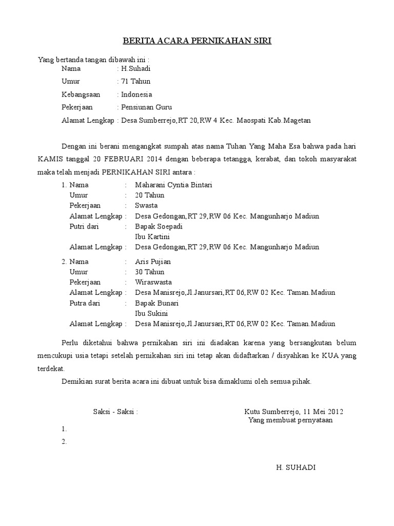 Jika salah satu dari kedua parameter tersebut belum terpenuhi maka pernikahan tersebut belumlah dapat diakui secara resmi di negara ini. Contoh surat keterangan nikah siri dari desa have an image from the other contoh surat keterangan nikah siri dari desa it also will feature a picture of a sort that may be observed in the gallery of contoh surat keterangan nikah siri dari desa. 15 contoh surat pengantar nikah paling lengkap semua orang tentu berharap bisa menikah pada usia pernikahan ideal. Pada surat pernyataan perkawinan sirih anda sudah harus membaca semua yang tertulis disana yang salah satu isinya jika dikemudian hari terdapat hal hal yang tidak di inginkan maka saya bersedia diproses secara hukum menurut undang undang yang berlaku. Sementara untuk surat keterangan cerai dari pihak berwenang biasanya harus menggunakan kop surat. 5 contoh format surat pernyataan nikah siri yang sah pernikahan secara resmi yang dinyatakan di indonesia harus diakui secara hukum oleh agama dan negara.