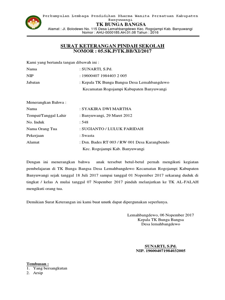 Contoh surat keterangan pindah sekolah tk. Itu tadi penjelasan singkat tentang contoh surat pindah sekolah dari kami sekian dulu pada kesempatan kali ini kita sambung lain kali dengan penjelasan tentang jenis surat yang lain tentunya. Pengertian surat keterangan pindah sekolah adalah surat keterangan yang dikeluarkan oleh kepala sekolah atas dasar surat permohonan pindah sekolah dari orang tua atau wali murid yang menerangkan tentang kepindahan sang anak. Surat permohonan pindah sekolah adalah surat yang dibuat oleh orang tuawali murid yang diajukan kepada kepala. Pengertian surat keterangan pindah sekolah adalah surat keterangan yang dikeluarkan oleh kepala sekolah atas dasar surat permohonan pindah sekolah dari orang tua atau wali murid yang menerangkan tentang kepindahan sang anak. Download contoh surat permohonan pindah sekolah paud tk kb tpa sps format doc yang dapat di edit. Berbeda dari surat sebelumnya yang hanya terdiri dari satu bagian surat ini terdiri dari dua bagian karena dilengkapi formulir yang harus diisi oleh pihak sekolah tujuan.