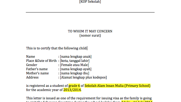 Contoh surat keterangan sekolah untuk visa dalam bahasa inggris. Karena surat ditujukan ke sekolah dan kepada guru maka bahasa yang digunakan harus sedikit formal atau setidaknya menggunakan bahasa baku. 2 contoh surat keterangan kerja dalam bahasa inggris mencari sebuah pekerjaan bukanlah hal yang mudah. Namun bukan tidak mungkin jika anda akan membutuhkan surat keterangan kerja dalam bahasa inggris seperti untuk pengurusan visa. Kita harus memiliki skill atau kemampuan yang bisa membantu kita untuk masuk ke dalam dunia kerja. Surat keterangan sehat dalam bahasa inggris. Dalam contoh surat izin tidak masuk kuliah dalam bahasa inggris kali ini mahasiswa yang tidak masuk adalah bernama andini rahma mahasiswi jurusan bahasa dan literatur inggris universitas pancasila di jakarta dengan alasan ketidakhadiran sakit selama satu hari.