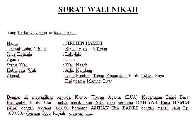 Contoh surat keterangan wali nikah nasab hakim 1430 persyaratan untuk nikah 1 comment. Surat keterangan wali nikah contoh surat numpang menikah bertemuco syarat contoh suratcara mengurus akte kelahiran pengalaman persyaratan nikah antar provinsi sukoharjo jombang. عن أبي بردة عن أبي موسى قال قال رسول الله صلى الله عليه وسلم لا نكاح إلا. Fotocopy ktp wali nikah 3. Surat keterangan pengantar menjadi wali nikah adalah surat yang dikeluarkan dari desakelurahan surat ini digunakandikeluarkan untuk melengkapi persyaratan pelaksanaan pernikahan bahwa yang bersangkutan benar benar berhak menjadi wali. Dimana biasanya ayah dari sang putri yang akan menikah tidak dapat hadir dikarenakan lokasi pernikahan yang terlalu jauh ataupun sang ayang dalam keadaan sakit.
