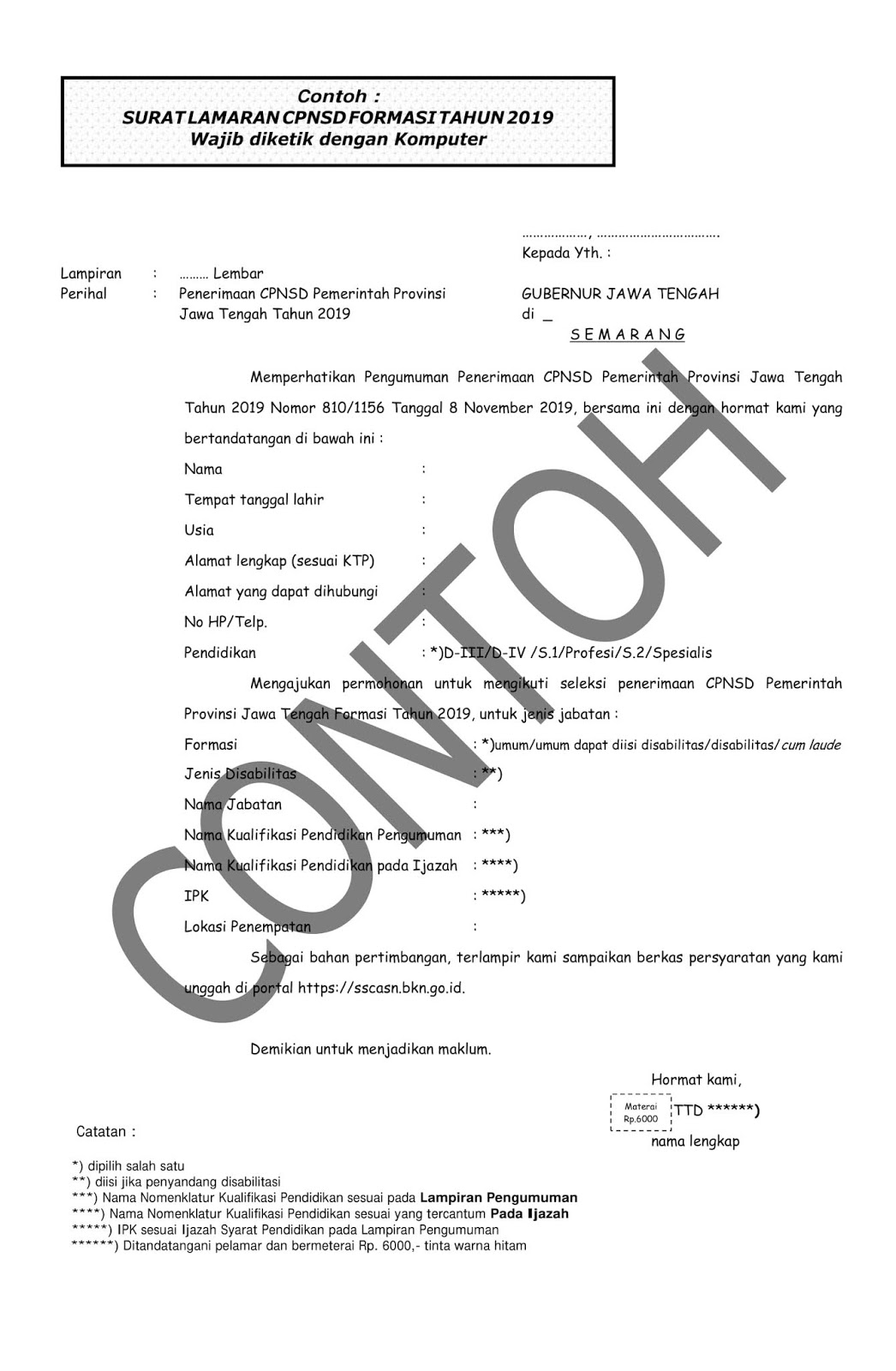 Dalam mendaftar cpns maka surat lamaran cpns tidak selamanya dibutuhkan. Pada penerimaan cpns 20192020 kali ini pemprov jateng memberikan contoh surat lamaran bagi peserta cpns. Namun bukan berarti jika surat lamaran cpns sama sekali tidak dibutuhkan oleh semua orang. Surat lamaran cpns 2019 yang dilampirkan di bawah adalah top 5 instansi yang diminati oleh pelamar. Ada beberapa instansi pemerintah yang mengharuskan surat lamaran ditulis dengan tangan. Digunakan atau tidak semuanya bergantung pada kebijakan instansi yang anda lamar atau anda pilih pada saat mendaftar cpns.