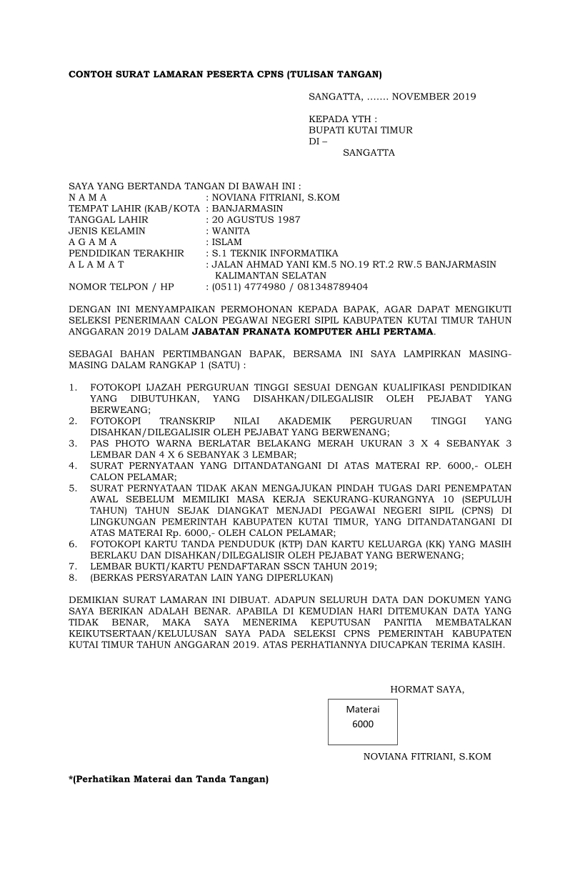 Lowongan cpns daerah kabupaten siak tahun 2013 mempedomani peraturan pemerintah nomor 11 tahun 2002 tentang pengadaan pegawai negeri sipil dan berdasarkan surat menteri negara pendayagunaan aparatur negara dan reformasi birokrasi republik indonesia nomor. Demikian surat lamaran ini dibuat adapun seluruh data dan dokumen yang saya berikan adalah benar.