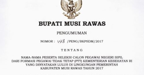 Musi rawas utara cpns 2018 kabupaten musi rawas utara kabupaten musi rawas utara adalah sebuah daerah otonomi baru dob di sumatera selatan yang merupakan pemekaran dari kabupaten indukn. 6091 orang umum. 23 sep 2018. Saudara i agar mengajukan permohonan untuk dapat mengikuti seleksi penerimaan calon pegawai negeri sipil. Informasi surat lamaran cpns 2018 kabupaten musi rawas utara sehubungan dengan penerimaan calon pegawai negeri sipil cpns kabupaten musi rawas utara tahun anggaran 2018. Musi rawas formasi tahun.