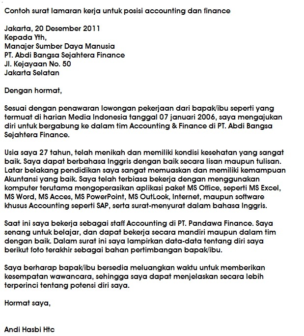 Surat lamaran kerja memberi anda kesempatan untuk menunjukkan kualifikasi dan pengalaman anda yang berhubungan dengan pekerjaan memperkuat resume anda dan meningkatkan kemungkinan untuk dipanggil interview. Semoga dapat bermanfaat dan membantu pembaca setia bdbi dalam membuat sebuah lamaran kerja dalam bahasa inggris yang baik dan benar. Hal terpenting yang harus diperhatikan pada saat membuat surat lamaran kerja berbahasa inggris adalah bahasa yang formal format yang benar dan tata cara penulisan yang baku baik dan benar. 1 lingkar selatan tanjung barat jakarta 12530 indonesia. Format dari contoh surat lamaran kerja sangat mempengaruhi diterima tidaknya kita ketika sedang melamar di perusahaan.