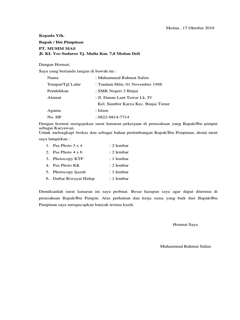 Contoh surat lamaran kerja di pt musim mas. Nah jika anda juga berencana melamar pekerjaan di perusahaan maka contoh surat lamaran kerja di persuahaan yang akan saya bagikan di bawah ini patut anda simak. Masih bingung membuat surat lamaran kerja. Contoh surat lamaran kerja adalah suatu hal yang sangat dibutuhkan oleh para orang yang sedang mencari pekerjaan yang sesuai dengan keinginannya. Lokerpbkcom loker pabrik cikarang paling baru agustus 2020. Kepala bagian personalia the blitz jl. Contoh surat lamaran kerja contoh 1 yogyakarta 10 januari 2019 kepada yth.