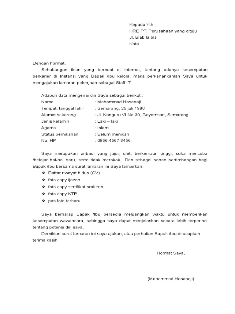 Dengan hormat sesuai dengan adanya informasi lowongan pekerjaan sebagai staff produksi di pabrik tahu bundar. Ada banyak pilihan pekerjaan yang bisa anda jadikan pilihan. Jika anda ingin membuat surat lamaran pekerjaan yang akan dikirim melalui e mail anda harus men scan terlebih dahulu berkas anda buat menjadi satu folder dengan ukuran maksimal 300kb atau sesuai kriteria yang diminta oleh perusahaan. Apakah kamu sedang mencari contoh surat lamaran kerja bahasa inggris cover letter misalnya karena ingin melamar kerja ke perusahaan multinasionalmeskipun proses mencari pekerjaan sudah terjadi sejak lama namun tak banyak orang yang dapat membuat surat lamaran pekerjaan yang baikhal ini karena kurangnya pembekalan bagi mahasiswa dalam hal persiapan untuk melamar pekerjaan ke sebuah. Contoh surat lamaran kerja contoh 1 yogyakarta 10 januari 2019 kepada yth. Pimpinan hrd pabrik tahu bundar di tempat.