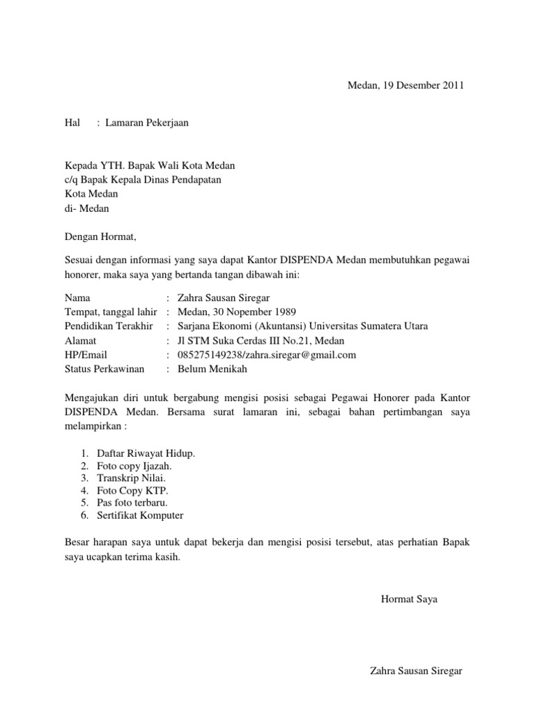 Berikut adalah detail contoh surat lamaran kerja ke dinas pendidikan. Tentu surat lamaran kerja guru langsung tertuju pada posisi pengajarguru. Namun saya ingatkan terlebih dulu bahwa pada postingan sebelumnya saya sudah share contoh surat lamaran kerja lulusan smkapabila anda membutuhkan informasi untuk menulis surat lamaran pekerjaan. Surat lamaran pekerjaan jenis ini memiliki perbedaan pada bagian tujuan posisi yang dilamar. Hrd pt nusantara jl. Banyak sekali tipe tipe surat lamaran kerja dan kali ini saya akan membahas mengenai bagaimana cara dan contoh surat lamaran kerja pegawai honorer pemda yang baik dan benar bagi anda yang baru lulus sekolah menengah entah itu smk ataupun sma atau mungkin baru lulus kuliah dan belum sama sekali pernah membuat dan tahu apa itu surat lamaran kerja maka kamu sudah tepat sampai di postingan ini.