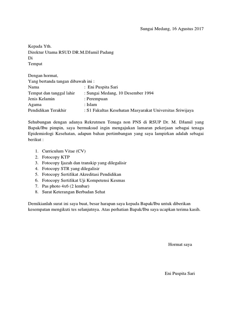 Lampiran yang dibutuhkan jika anda sedang bersiap untuk mengirimkan lamaran di rumah sakit pastikan anda mempersiapkan lampiran berikut ini. Contoh surat lamaran kerja di perusahaan seringkali dicari oleh para pencari kerja yang ingin mengajukan lamaran pekerjaan di perusahaan perusahaan yang ada di indonesia. Bagi anda yang sedang mencari referensi surat melamar kerja lanjutkanlah membaca artikel ini hingga akhir. Agar menjadi lebih contoh surat lamaran kerja 2019 terbaru dan paling menarik maka kamu harus berusaha menulis surat lamaran sebaik mungkin. Contoh surat lamaran rsud sleman have an image from the other contoh surat lamaran rsud sleman it also will feature a picture of a sort that could be observed in the gallery of contoh surat lamaran rsud sleman. Lulusan perawat bisa melamar ke sebuah rumah sakit ataupun puskesmas.
