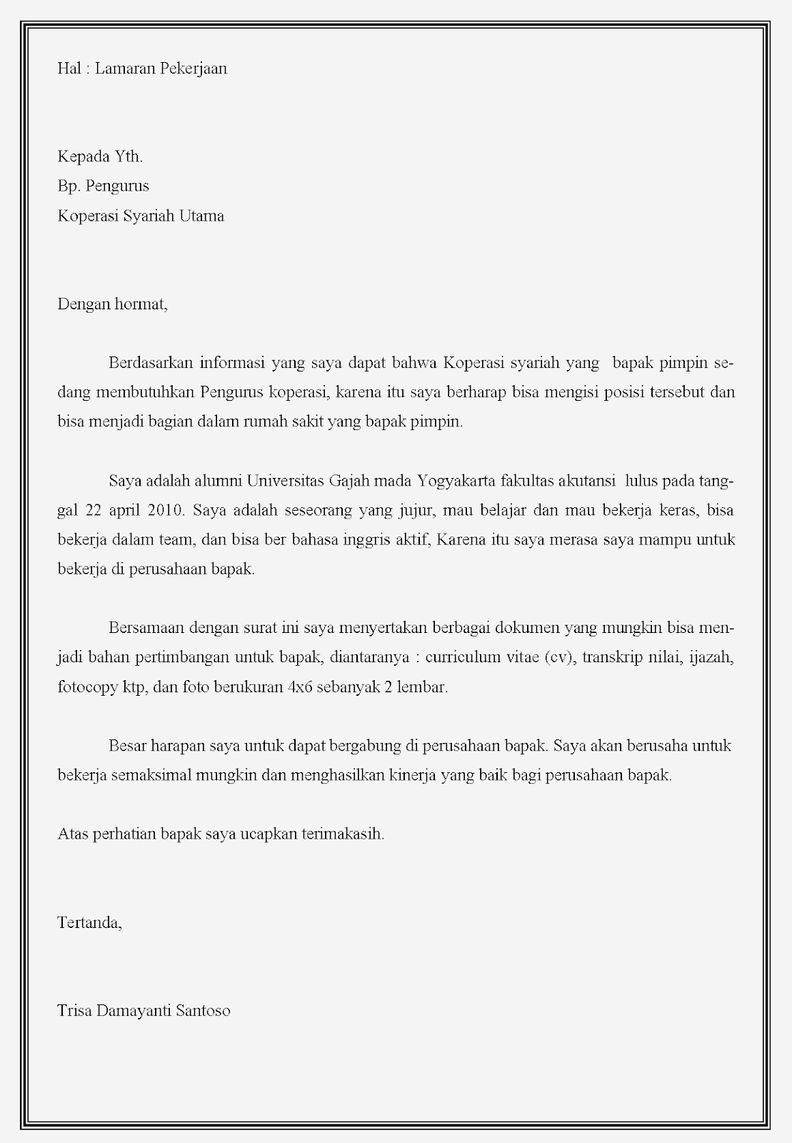 Contoh surat lamaran kerja sekretaris bagi anda para job seeker tentu tidak asing dengan surat lamaran pekerjaan. Contoh surat lamaran kerja dalam bahasa inggris posisi sekretaris pekerjaan sebagai seorang sekretaris biasanya banyak dilakoni oleh para kaum perempuan. Tujuannya tentu adalah anda ingin mendapatkan kesempatan untuk mengikuti seleksi yang di adakan oleh perusahaan atau instansi tempat anda melamar. Rasuna said kav 27 jakarta selatan dear sir in response to your advertisement in todays issue of jakarta post for a secretary to marketing manager i wish to offer my self for the post. Didalam pembuatan surat lamaran hindari bahasa yang tidak pantas seperti slang atau jargon teknis. Contoh surat lamaran kerja dalam bahasa inggris beserta artinya terbaru apakah sahabat sbi ingin membuat surat permohonan lamaran kerja.