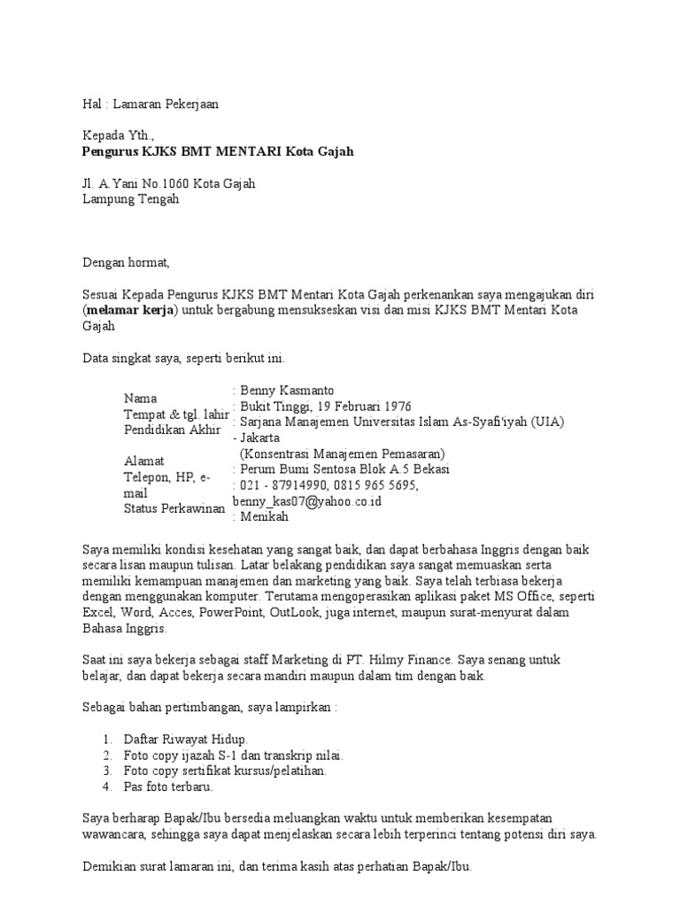 Contoh surat lamaran kerja staff marketing. Seperti menyusun surat lamaran kerja pada umumnya tentu terdapat beberapa poin yang perlu diperhatikan ketika menyusun surat lamaran kerja marketing. Tapi saya ingatkan kembali bahwa pada postingan saya sebelumnya saya juga sudah membagikan contoh surat lamaran kerja staf tata usahaapabila anda membutuhkan referensi dalam menulis surat. Contoh surat lamaran kerja marketing saat kamu ingin melamar pekerjaan di divisi marketing di berbagai perusahaan swasta maupun instansi bumn seperti pttelkomsel tokopedia gojek grab bukalapak pertamina indosat shell pln atau lainnya pasti hal pertama yang harus kamu lakukan sebagai pelamar adalah membuat surat lamaran kerja marketing yang baik dan benar. Pada dasarnya tidak ada perbedaan mendasar antara surat lamaran kerja marketingdengan surat lamaran kerja lain pada umumnyahanya posisi tujuan melamar pekerjaannya saja yang dikhususkan marketing. Baik mereka yang baru lulus kuliah s1 atapun mereka yang lulus sma atau smk tidak hanya mereka yang fresh graduate yang membutuhkan surat lamaran kerja mereka yang ingin pindah kerja juga membutuhkan surat lamaran kerja untuk tempat pekerjaan. Contoh surat lamaran kerja adalah suatu hal yang sangat dibutuhkan oleh para orang yang sedang mencari pekerjaan yang sesuai dengan keinginannya.