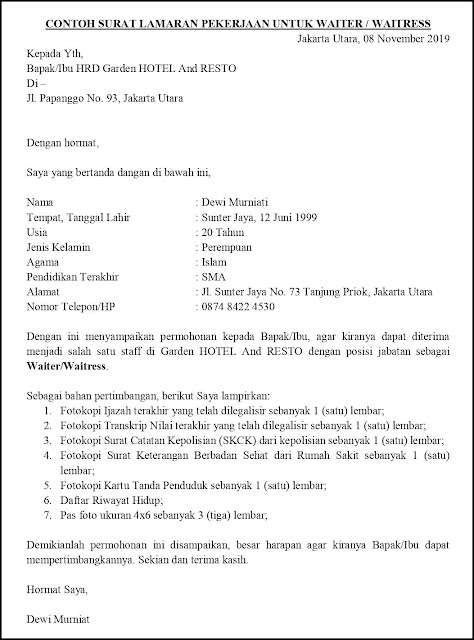 Contoh surat lamaran kerja waiter dan waitress bagi anda seorang calon pekerja yang sekarang ini sedang sibuk mencari lapangan pekerjaan dan kebetulan ingin mencoba melamar di bidang kuliner seperti menjadi pelayan atau waiter waiters di restoran dan kafe tentu harus paham betul mengenai hal hal yang berkaitan agar diterima di tempat yang anda lamar sebagai tempat kerja salah satu yang. Jadi untuk menulis surat lamaran kerja di cafe harus jelas posisi apa yang dilamar apa saja yang dilampirkan dan biodata singkat dari pelamar. Dalam surat lamaran pekerjaan dapat menentukan seseorang diterima atau tidak.