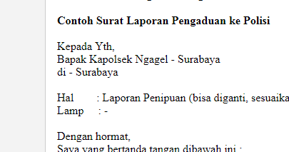 Contoh surat laporan pengaduan ke polisi. Kepada yth bapak kapolsek ngagel surabaya. Contoh surat laporan pengaduan ke polisi. Contoh surat laporan pengaduan ke polisi sebagai aparat memberikan pelayanan serta pelindungan hukum kepada masyarakat maka jika anda merasa telah dirugikan oleh seseorang atau telah menjadi korban tindak kriminal anda bisa melaporkan perkara tersebut kepada pihak kepolisian. Surat laporan pengaduan ke polisi berbagai contoh surat telah dihadirkan pada website ini baik itu yang berbentuk format surat draft maupun contoh lengkapnya. Begitulah yang dapat admin bagikan terkait contoh surat laporan pengaduan ke polisi tentang pencemaran nama baik. Contoh surat laporan pengaduan ke polisi sebagai aparat memberikan pelayanan serta pelindungan hukum kepada masyarakat maka jika anda merasa telah dirugikan oleh seseorang atau telah menjadi korban tindak kriminal anda bisa melaporkan perkara tersebut kepada pihak kepolisian.