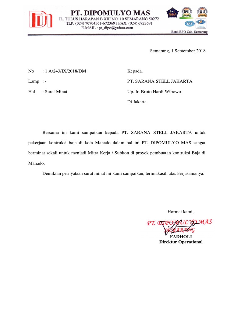 Contoh surat minat proyek yang baik dan benar untuk kegiatan pelelangan yang dapat dijadikan referensi pembuatan surat resmi yang profesional. Demikian surat minat letter of intent. Surat minat proyek merupakan bagian dari jenis surat minat atau lebih dikenal dengan nama letter of intent loi yang bertujuan untuk menunjukkan ketertarikan sekaligus komitmen seseorang atau perusahaan terhadap sesuatu hal dalam bisnis baik untuk membeli untuk ikut berpartisipasi dalam suatu bisnis atau keinginan apapun dari suatu entitas bisnis terhadap relasi bisnisnya. Penerbitan surat minat atau lebih dikenal dengan letter of intent loi bertujuan untuk menunjukkan komitmen seseorang atau perusahaan tertarik atau berminat terhadap sesuatu hal dalam bisnis baik untuk membeli untuk ikut berpartisipasi dalam suatu bisnis atau keinginan apapun dari suatu entitas bisnis terhadap relasi bisnisnya. Surat penawaran alat berat. Surat penawaran proyek dapat dibuat dengan menggunakan software pengetikan seperti microsoft excel atau microsoft word format diatas hanya sebagai contoh yang dapat dirubah dan disesuaikan dengan standar perusahaan masing masing atau menyesuaikan format penawaran yang diminta oleh pemilik proyek.