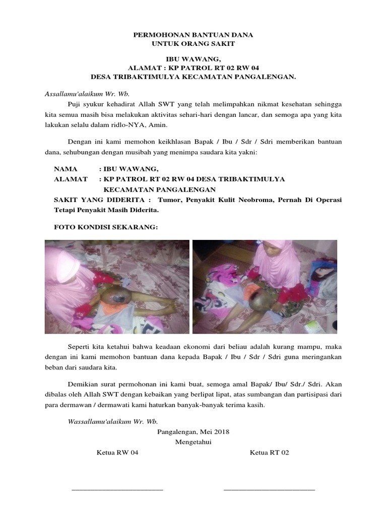 Demikian surat permohonan ini kami buat atas sumbangan dan partisipasi dari para dermawan dermawati kami haturkan banyak banyak terima kasih. Saya tjia bartolonius leonardo papa nya christian angelo leonardo memohon bantuansumbangan nya kepada teman teman dan para donatursukarelawan untuk biaya perawatan rumah sakit anak saya yang cukup besar bisa dikirim melalui. No rek bank bca. Jika masih penasaran berikut contoh surat permohonan bantuan untuk bahan pembelajaran daftar isi artikel1. Surat permohonan bantuan adalah jenis surat memohon bantuan samada kewanganpendidikandana perniagaanrumah dan biasiswa dari sesebuah organisasiagensi dan individu. Admin blog contoh seputar surat 2019 juga mengumpulkan gambar gambar lainnya terkait contoh surat minta sumbangan untuk orang sakit dibawah ini.