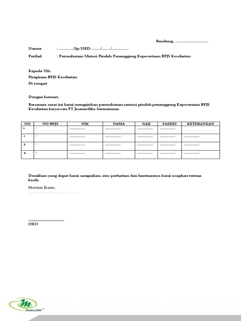 Contoh surat permohonan penambahan peserta bpjs kesehatan. 1 softcopy kolom 37 1 softcopy kolom 34 kepada yth kepala unit kepesertaan bpjs kesehatan kantor cabang utama jakarta selatan di tempat melalui surat ini. Bpjs kesehatan kantor pusat jl letjen suprapto cempaka putih po box 1391 jkt 10510 021 4212938 hunting. Surat permohonan mutasi peserta jkn kis. Untuk bpjs tk saldo dari perusahaan lama bsa digabungkan dengan saldo kepesertaan bpjstk di perusahaan baru. Agar tidak terkena tunggakan sebaiknya mengubah status bpjs perusahaan menjadi mandiri sehingga anda hanya perlu membayar iuran anda sendiri.
