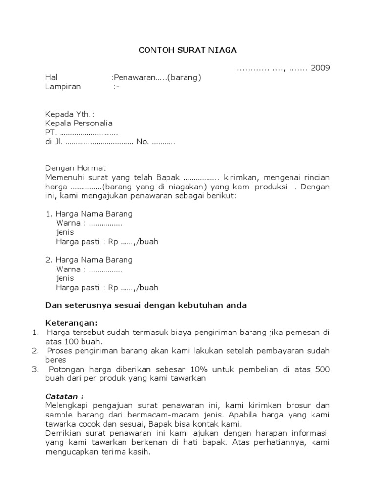 Contoh surat niaga penawaran barang. Surat niaga dipergunakan dalam berbagai keperluan perusahaan untuk mendapatkan keuntungan sebanyak banyaknya. Surat menyurat tidak akan lepas dari duni perdangangn. Disamping memiliki pengaruh yang baik untuk membuat jenis usaha kita dapat laris dan laku dipasaran. Contoh surat niaga permintaan barangdi artikel lainnya kita sudah membahas tentang surat bisnis surat penawaran dan berbagai jenis surat lainnyasatu lagi yang akan saya tambahkan di dalam koleksi artikel tentang surat yang saya buat ini adalah surat niaga. Surat ini dibuat untuk mencari keutungan dengan membangun kerjasama dengan pihak atau badan usaha tertentu. 15 contoh surat niaga penawaran untuk berbagai keperluan surat niaga penawaran dibuat untuk melakukan penawaran barang jasa atau kerjasama dalam bentuk surat resmi.