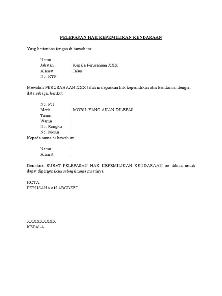 Contoh surat pelepasan hak kendaraan pt. Demikian surat pelepasan hak ini dibuat untuk dapat dipergunakan sesuai peruntuknya. Itulah yang dapat kami bagikan terkait contoh surat pelepasan hak kendaraan bermotor perusahaan. Untuk hal tertentu surat ini juga diperlukan saat suatu perusahaan membeli sebuah kendaraan baru di dealer kendaraan. Adalah benar kendaraan milik perusahaan pt. Majikan akan mengeluarkan satu surat pelepasan yang akan melepasakan pekerja dari jawatan kerja. Beberapa contoh surat pelepa.