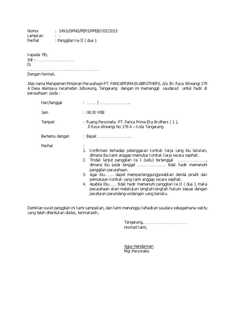 Karena surat ini termasuk surat resmi maka pembuatan nya juga harus mengikuti aturan resmi seperti menggunakan bahasa yang formal singkat padat dan jelas menggunakan kop surat nomor perihal lampiran dan lain sebagainya. Pada pagi hari ini admin akan kembali membagikan contoh surat panggilan namun pada postingan sebelumnya admin juga sudah pernah membagikan contoh surat panggilan kerja dari perusahaan. Contoh surat panggilan karyawan mangkir adalah surat yang akan dibutuhkan oleh sebuah perusahaan lembaga atau instansi pemerintahan untuk memanggil para pegawai atau karyawannya yang bermasalah terkait perihal tidak masuk kerja. Jika melanggar kedisiplinan di dalam perusahaan tersebut selama bekerja maka bukan tidak mungkin anda juga akan mendapatkan surat teguran seperti pada contoh di bawah ini. Karena keadaan yang sehat selalu akan membuat kita fresh dalam aktivitas apapun. Contoh surat panggilan untuk karyawan halo sahabat surat semua bagaimana kabar anda.