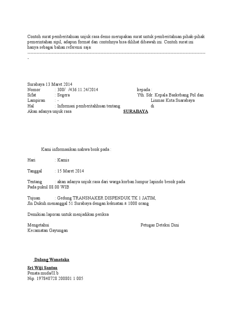 Ingat untuk melakukan unjuk rasa yang dibutuhkan hanya surat pemberitahuan dan bukan surat izin karena kebebasan menyampaikan pendapat adalah hak asasi yang dijamin oleh konstitusi dan undang undang sehingga bebas dilaksanakan sepanjang tertib damai dan tidak mengganggu kepentingan umum. Perlu diingat bahwa setiap kegiatan penyampaian pendapat di muka umum bik dalam bentuk aksi ujuk rasa atau demonstrasi pawai rapat umum atau mimbar bebas harus dilakukan sesuai dengan syarat dan ketentuan yang diatur oleh peraturan perundang undangan yang berlaku. 15 contoh surat pemberitahuan yang baik dan benar surat pemberitahuan adalah sebuah surat yang biasanya bersifat resmi dan dikeluarkan oleh pihak pihak resmi seperti sekolah instansi pemerintahan dan juga perusahaan. Contoh surat ini hanya sebagai bahan referensi saja surabaya 13 maret 2014. Contoh surat pemberitahuan kenaikan harga barang kepada pelanggan nah itulah 8 contoh surat pemberitahuan yang bisa menjadi rujukan anda dalam menulis suratcontoh surat pemberitahuan kenaikan harga. Kebanyakan memang digunakan oleh perusahaan instansi pemerintahan lembaga maupun organisasi.