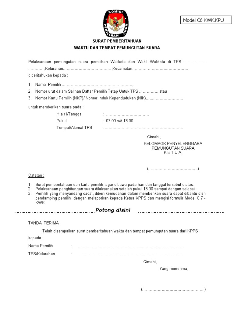 Surat rekomendasi pernyataan untuk ijin kuliah. 15 contoh surat dinas pemerintah paling lengkap instansi pemerintahan tidak terlepas dari kegiatan surat menyurat. Selamat pagi kpps cikakak seperti yang telah kami singgung sedikit pada artikel pelantikan kpps bahwa model c6 kwk atau surat pemberitahuan pemungutan suara pada kepada pemilih sudah didistribusikan ke pps cikakak kemarin malam kami sudah menghitung dan membagi untuk setiap tps dan jumlahnya masih kurang 120 lembar dan sudah kami laporkan ke ppk banjarharjo. Contoh surat mandat saksi pemilihan ketua rt dan k. Selain itu surat pemberitahuan juga bisa saja berisi kegiatan. Dompu bimakini formulir model c6 kwk merupakan surat pemberitahuan pemungutan suara kepada pemilih.