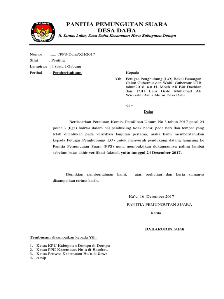 Berita acara serah terima surat suara pemilihan ke. Admin blog kumpulan surat penting juga mengumpulkan gambar gambar lainnya terkait surat pemberitahuan pemungutan suara kepada pemilih dibawah ini. Diantara banyak surat yang sering masuk maupun keluar adalah surat pemberitahuan. Indonesia berkarya website dukungan informasi pendidikan pemerintahanlowongan kerja dan contoh contoh surat keterangan praktis dan. Ketua divisi sdm dan partisipasi masyarakat kpu dompu suherman spd mengatakan.