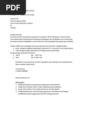 Contoh surat penawaran beras. Namun ada kalanya anda membutuhkan perusahaan lain dan menawarkan untuk memasarkan dan menjadi distributor produknya. Disamping memiliki pengaruh yang baik untuk membuat jenis usaha kita dapat laris dan laku dipasaran. Bila anda ingin punya usaha jajanan gerobak dengan penjualan keliling dan ingin mengembangkannya di beberapa wilayah jual perlu pertimbangan harga secara khusus. Contoh surat penawaran surat penawaran jasa merupakan surat usaha yang dikeluarkan berbarengan dgn penawaran satu produk jasa pembaca pada calon konsumen potensial. Ada banyak contoh dan jenis surat yang dipergunakan oleh setiap perusahaan semua memiliki tujuan dan kegunaan masing masing. Contoh surat penawaran harga beras adalah gambar contoh penawaran berdefinisi tinggi dan memiliki ukuran 768x1024.