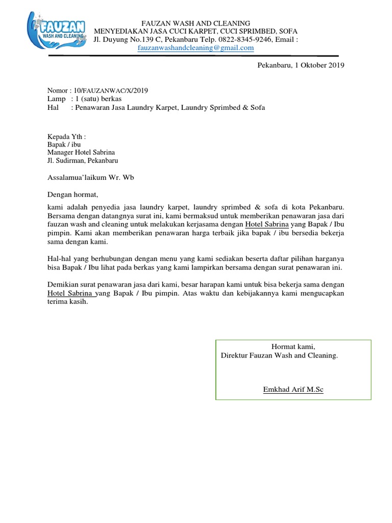 Semoga berguna untuk anda. Maka dari itu akan sangat baik jika anda memberikan contoh surat penawaran jasa laundry kepada mereka. Artikel ini bisa menjadi referensi anda ketika anda bingung memilih format yang tepat untuk surat penawaran anda. 15 contoh surat penawaran jasa yang baik dan paling lengkap dalam menjalankan sebuah perusahaan tentu akan sangat sering menggunakan surat niaga. Contoh surat penawaran jasa laundry hotel ini adalah contoh sesungguhnya bukan rekayasa. Proposal ini dirasa cukup penting disaat kita ingin memperluas cakupan konsumen tidak hanya konsumen personal.