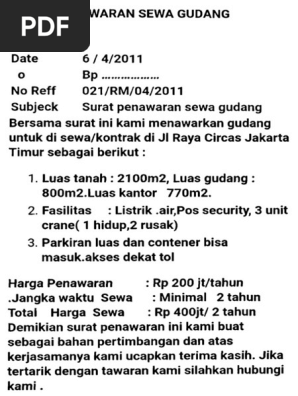Surat permintaan penawaran adalah surat yang dibuat oleh calon pembeli berisi permintaan penawaran kepada penjual. Demikianlah surat perjanjian sewa gudang ini dibuat dan ditandatangani oleh pihak pertama dan pihak kedua di suka maju pada hari sabtu tanggal delapan belas bulan empat tahun dua ribu dua puluh dalam keadaan sadar tanpa adanya paksaan atau tekanan dari pihak manapun. Contoh surat penawaran surat penawaran yaitu surat yang ditulis guna menyampaikan maksud suatu perusahaan untuk menjalin kerjasama dengan perusahaan lainnya. Surat penawaran sewa gudang bersama surat ini kami menawarkan gudang untuk di sewakontrak di jl raya circas jakarta timur sebagai berikut. Jenis surat ini tergolong masih merupakan salah satu jenis surat yang masih relevan untuk digunakan pada saat sekarang ini. Surat perjanjian sewa gudang pada hari ini tanggal bulan tahun dua ribu tigabelas 2013 kami yang bertandatangan di bawah ini.