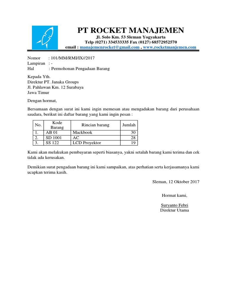 Contoh surat pengajuan barang. Itu tadi penjelasan singkat beserta 1 contoh surat pengajuan barang yang kami berikan pada kesempatan kali ini. Dalam hal ini pengadaan semua inventaris kantor yang digunakan tentu harus melewati beberapa tahap dan pertimbangan terlebih dahulu. Dengan adanya format surat tersebut maka akan jauh lebih mudah dalam mengonsep surat ketika sewaktu waktu dibutuhkan. Contoh surat penawaran surat penawaran yaitu surat yang ditulis guna menyampaikan maksud suatu perusahaan untuk menjalin kerjasama dengan perusahaan lainnya. Baik itu di perusahaan instansi pemerintahan bahkan juga lembaga swasta dan pemerintah. Contoh surat pengaduan komplain pada kegiatan pembelian sebuah produk penting diperhatikan bahwa produk yang kita pilih berkualitas baikproduk dikatakan baik apabila tidak ada kecacatan secara fisik dan tidak rusak.