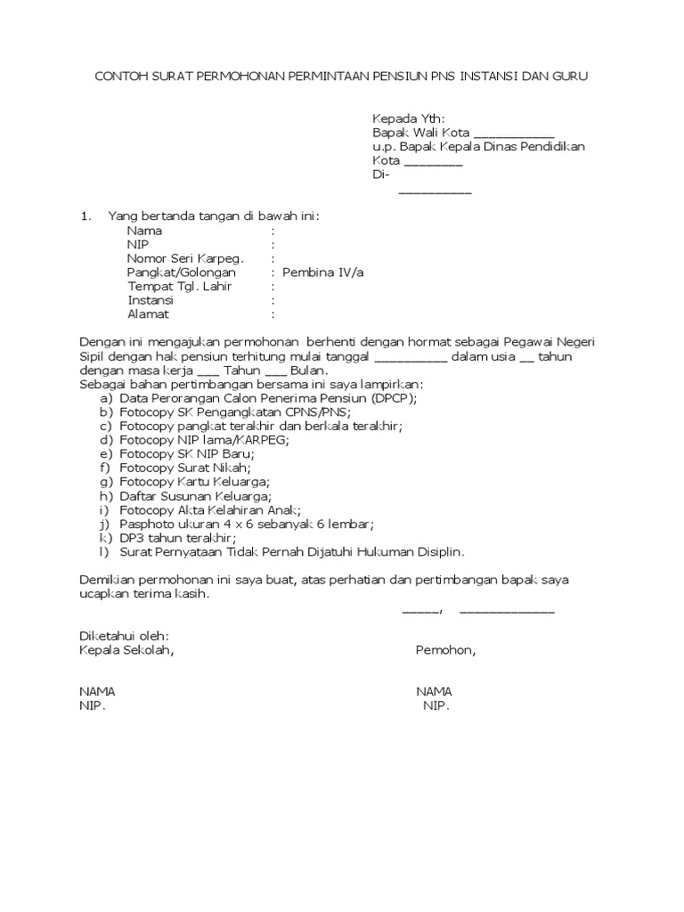 Surat permohonan kenaikan pangkat pengabdian dan pemberhentian dengan hormat sebagai pegawai negeri sipil dengan hak pensiun. Surat dpcp data calon penerima pensiun pns yang mencapai batas usia pensiun dari ybs diketahui kepala unit kerja fotocopy sk cpns 80 dilegalisir oleh sdm fotocopy sk pns 100 dilegalisir oleh sdm fotocopy sk kenaikan pangkat terakhir dilegalisir oleh sdm. Download contoh surat pengantar berbagai keperluan dinas july 6 2019 by nurul saputro surat pengantar adalah surat yang dibuat guna tujuan agar dapat memberitahukan kepada pihak yang akan dituju bahwasannya hal yang akan dilakukan oleh si pembawa surat telah diketahui dan setujui oleh pihak yang bertanggung jawab. Contoh surat pengantar surat izin keramaian prosedur pembuatan surat ijin keramaian informasi mekanisme penerbitan surat ijin keramaian dasar juklap kapolri no. Surat permohonan permintaan pensiun terbaru dibuat oleh guru pns yang telah habis atau selesai masa baktinya tarpaut batas usia penuh. Jika bapakibu guru pns belum memiliki contoh surat permohonan usulan pensiun terbaru bisa mengunduhnya diakhir postingan.