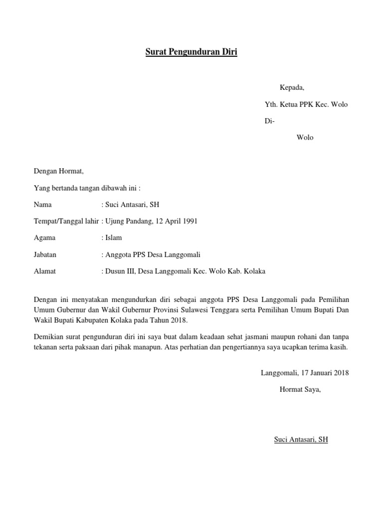 Contoh surat pengunduran diri atau contoh surat resign yang baik dan benar. Bermaksud mengundurkan diri sebagai anggota panitia pemilihan kecamatan ppk pemilihan umum tahun 2019 kecamatan kedungkandang kab. Contoh surat pengunduran diri oraganisasi bagi kamu yang ingin mengundurkan diri dari sebuah posisi di institusi perusahaan atau lembaga organisasi langkah yang umum dilakukan adalah mengajukan sebuah surat pengunduran diri resign letter. Contoh surat teguran atau surat peringatan sp yang baik dan benar. Seluruh organisasi baik yang berkecimpung di dunia masyarakat sekolah universitas badan olahraga ataupun politik apabila salah satu anggotanya memutuskan untuk keluar harus memberikan surat. Mengundurkan diri dari sebuah organisasi adalah sebuah keputusan yang sangat besar dan untuk merealisasikan keputusan yang sudah dibuat tentu kita harus membuat surat pengunduran diri yang baik.