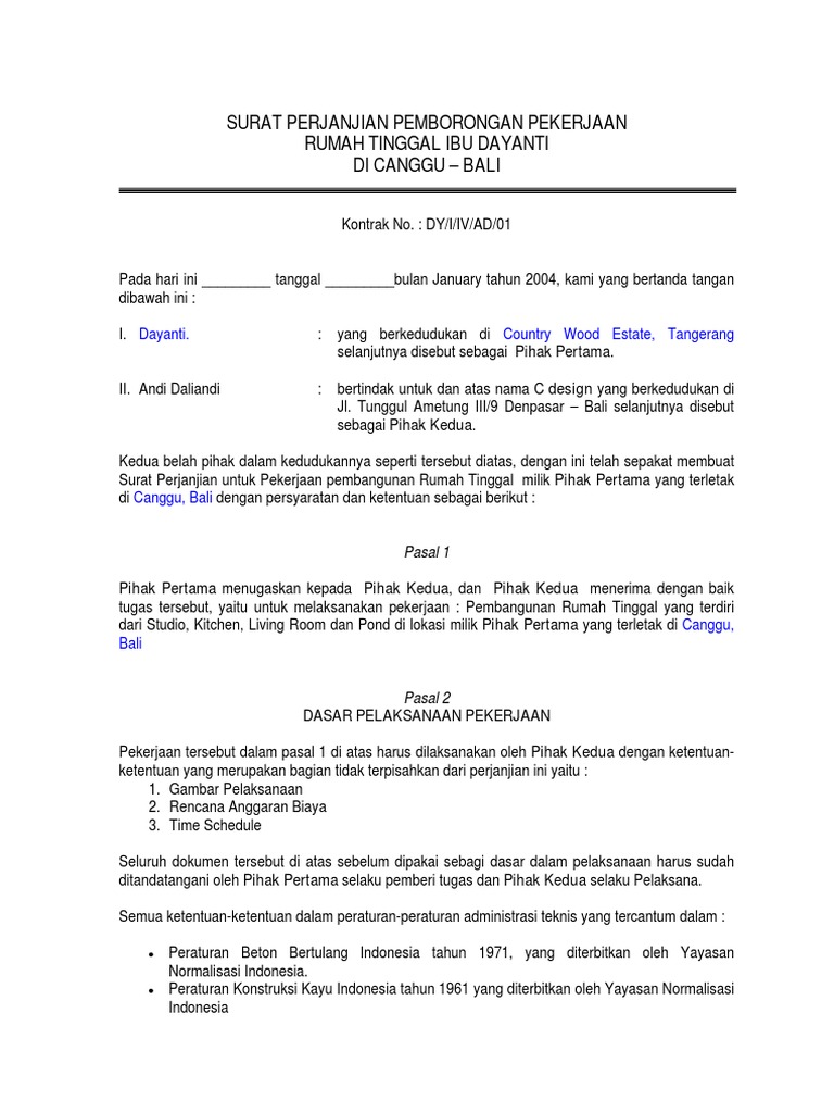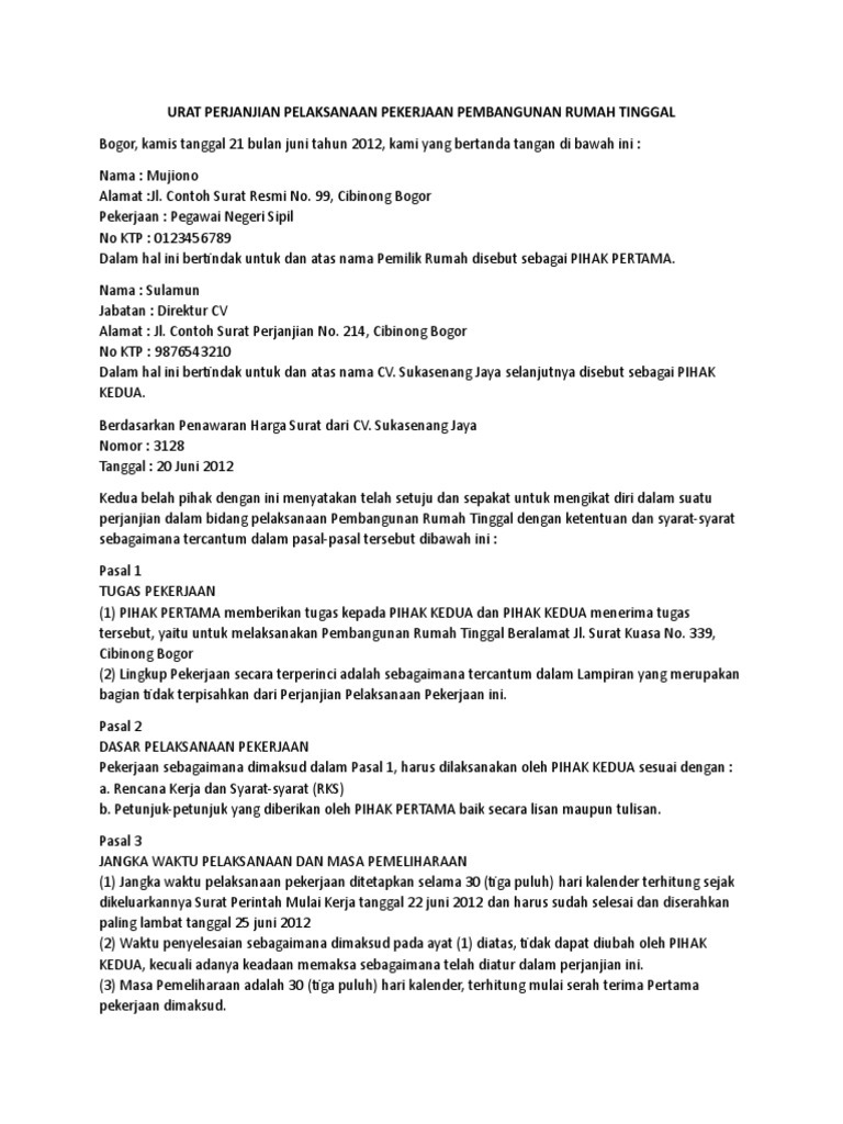 Contoh surat perjanjian pembangunan rumah. Contoh surat kontrak perjanjian pembangunan 1. Surat perjanjian pelaksanaan pekerjaan pembangunan rumah tinggal. Lamudi pun mengutip beberapa bagian penting dari contoh surat perjanjian sewa rumah yang dapat anda unduh dari link di akhir artikel ini. Identitas pihak pertama dan pihak kedua identitas lengkap termasuk nama lengkap umur pekerjaan hingga nomor ktp oleh kedua belah pihak. 339 cibinong bogor 2 lingkup pekerjaan secara terperinci adalah sebagaimana tercantum dalam lampiran yang merupakan bagian tidak terpisahkan dari perjanjian pelaksanaan pekerjaan ini. Surat perjanjian ini bukanlah contoh yang sempurna.