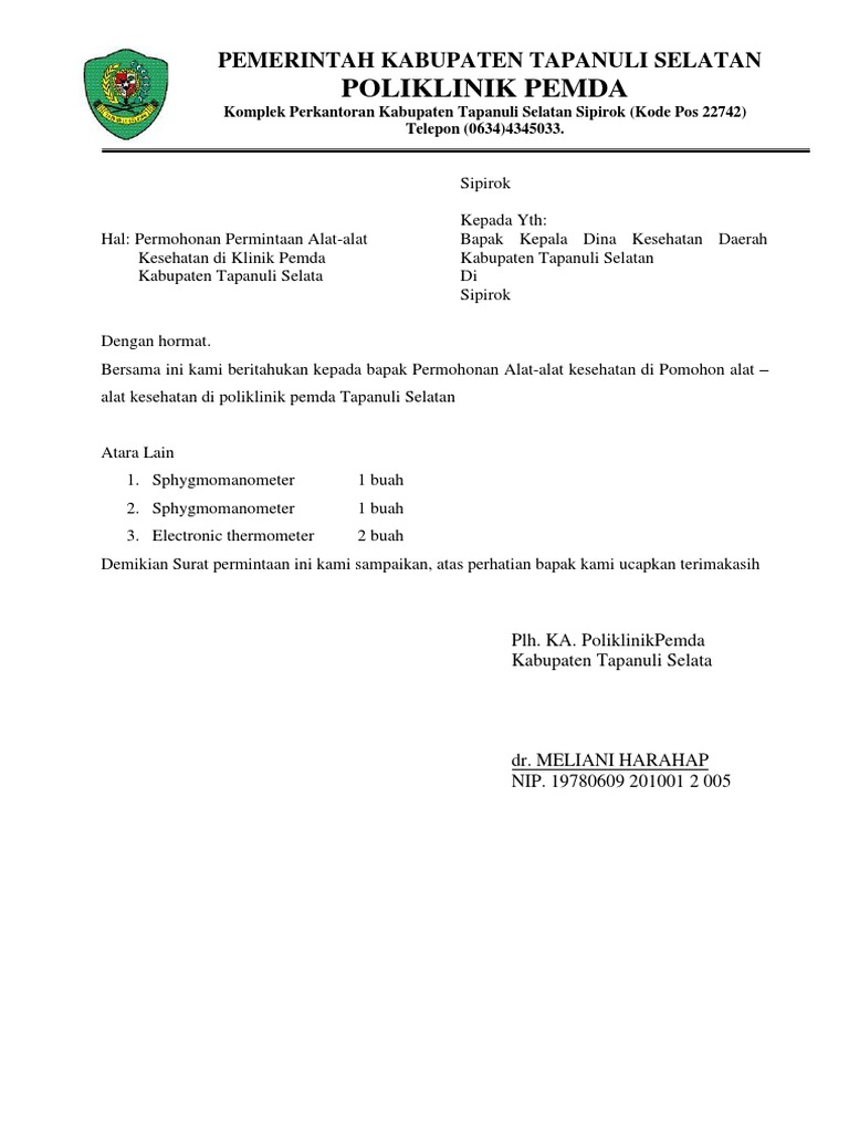 Contoh surat permintaan alat kesehatan. Saya akan memberikan sedikit ilmu tentang membuat surat permohonan penyediaan alat surat ini di tujukan untuk dinas pemuda dan olahraga dki jakarta. Surat permohonan berisi tentang sebuah permintaan tentang sesuatu hal kepada pihak yang bersangkutan. Contoh format surat permohonan kepada dinas kesehatan untuk diangkat menjadi tenaga bidan pegawai tidak tetap contoh format surat permohonan dibawah ini sengaja saya tulis bagi anda yang ingin menjadi tenaga bidan pegawai tidak tetap. Surat permohonan penyediaan alat. Semoga kita diberi kesehatan. Ayani km39 desa padang kecamatan bati bati kode pos 70852 nomor lampiran.