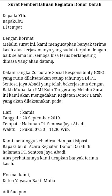 Contoh surat permohonan donor darah ke pmi doc. Inilah pembahasan selengkapnya mengenai contoh surat permohonan donor darah ke pmi doc. Surat permohonan donor darah ini digunakan untuk meminta izin kepada pihak setempat agar pelaksaan acara donor darah berjalan lancar. Adapun salah satu kegiatan tersebut ialah acara donor darah. Demikian surat permohonan ini kami sampaikan atas perhatian dan kerjasamanya disampaikan banyak terima kasih. Permohonan pelaksanaan donor darah lampiran. 0900 sd 12 wib area.