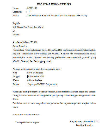 Contoh surat izin orang tua. Semua orang tahu jika syarat demikian memang berat. Dalam kondisi ini kamu perlu membuat surat izin orang tua yang menyatakan bahwa kamu benar benar sakit. Contoh surat izin orang tua pernah ngga kamu tiba tiba sakit saat mau berangkat sekolah. 3 contoh surat izin orang tua untuk kegiatan pramuka pramuka adalah salah satu organisasi yang mungkin akan kita temukan di setiap sekolah. Walaupun sudah tersedia berbagai komunikasi canggih dan modern sekarang ini namun penggunaan surat tetap saja tidak bisa ditinggalkan.